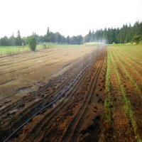 人参はすでに人力で水遣りをしています。写真は人参の水遣りの様子です。人参の種まきをした後に潅水(かんすい)チューブという細かな穴の開いたビニールチューブを這わせています。チューブの元には水の蓄えたタンクとエンジンポンプがつながっていてその圧力で水を飛ばしています。人参は発芽が命。発芽までの数日はほぼ毎日この作業が続きます。 |
