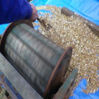 遅ればせながら大豆の脱穀です。12月の初めに収穫して、ようやく手を付けることが出来ました。足踏みの脱穀機を使って脱穀します。ペダルを踏んで回転させている櫛歯のついたドラムに刈り取った大豆の株をあてると、櫛歯にあたって莢から豆が飛び出します。そのあと唐箕(とうみ)と呼ばれる、風を利用する選別機で莢の殻やごみと豆を選り分けて脱穀完了です。今年は不作だったので1日で終わってしまいましたが何とか味噌造りには足りそうでホッとしています。 |