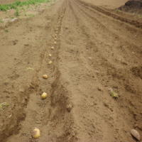 【2013.3.26】 今年は随分と暖かい3月だったようです。桜もあっという間に満開近くまで咲きました。小松菜やチンゲン菜などアブラナ科の葉物たちも去年より2〜3週間くらい早くとう立ってしまった感じです。 じゃがいもの植え付けを行いました。じゃがいもは種をまいて栽培するのではなく、皆さんにお届けしているのと同じいもを畑に植えて栽培します。台所に置いておいたじゃがいもから芽が出ていることがあります。それを畑に植えると、およそ3か月後にじゃがいもが土の中でできているのです。写真は畑に掘った溝に種芋を一定間隔で置いた所です。この後に土をかぶせて植え付けが完了です。今回の品種は「キタアカリ」。ほくほくとして甘味があります。6月下旬に収穫して新じゃがとしてお届けした後、しばらく熟成させて秋口から本格的にお届けします。また、じゃがいもの花は同じナス科(植物的にはナスやトマトの仲間です!)の花と同様、小さくてかわいい花です。その時期になりましたら野菜便りでご紹介します。 |