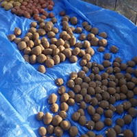 【2013.3,5】 先週は春一番や冬型の北風が吹き荒れたりと、風に散々な目にあった一週間でした。春一番がやってくると共にかなり暖かい日が続くようになりました。温度が上がり過ぎないよう、ビニールハウスや畑のビニールトンネルの朝晩の開閉が忙しくなってきます。 3月になり、これからどんどん忙しくなります。じゃがいもの植え付け、にんじんの種まき、夏野菜の鉢上げ、終了した冬野菜の畑の片付け、、、考えたらキリがありません。まずはじゃがいもの植え付け準備です。薄暗くひんやりした所に保管しておいた種じゃがいもを、ハウスなどの暖かい場所でカゴやシートにひろげます。上の写真はその様子です。しっかりと太陽に当てて、眠っていたじゃがいもを起こすのです。するとじゃがいもは次第に芽を出し始めますので、いよいよ畑に植え付けが始まります。 |