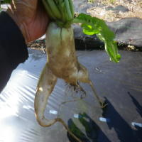 今週から大根がセットに入り始めます。太り具合を見ながら少しずつ畑から引っこ抜いています。中にはこんなものも、、、。今にも走り出して逃げてしまいそう、、。たまにこういうのがあれば楽しくてつい写真を撮ったりしていますが、あまり多いとやっぱりこれもまた考えものです。 |