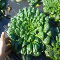 そんな中でも、比較的寒さに強いターサイなどは順調に大きくなってきました。大きく葉を広げて少しでも太陽の光を浴びようとしています。年間を通じて栽培できる野菜ですが、小松菜ともまた少し違った味の濃さで、寒さにしっかりあたった冬にこそ食べていただきたい葉物の一つです。ちょっと小さ目のクッションくらいの大きさになってきましたのでまもなく出荷できそうです。 |