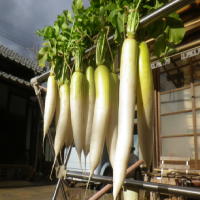 今年は初めてたくあん作りに挑戦しています。まずは干し大根作りから。たくあん用の大根を作っていないので、普通の青首大根の中からなるべく細くて長いものを選んでみました。2週間近くかけて「つ」の字に曲がるくらいに干します。日差しももちろん必要ですが、風に当たることによってうまく乾燥していくらしいです。干すことで甘みも増えていきます。例年だとこの時期は晴れの日が続くのでこういう干し作業にはピッタリなのですが今年はちょっと雨の日が多いようですね。うまく干せるかどうか心配です。 上手くいけば2月くらいには食べられるようになるらしいので楽しみです。 |