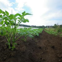 そんな中、秋じゃがいもの生育は順調です。青空と緑のコントラストがきれいです。生育開始当初のお盆過ぎからがあまり暑くなかったので、種芋が土の中で腐らずに発芽できたのだと思います。春のじゃがいもの収量が全くよくなかったのでとても期待大です。11月中旬から収穫になります。 |